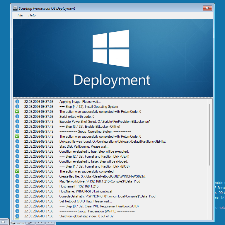 Das Scripting Framework System Deployment ermöglicht ein automatisiertes Deployment von Software und Betriebssystemen und stellt eine vollständige Lösung für Ihre OS- und Softwareverteilung dar. Die Console basiert auf unserer eigens entwickelten Deployment-Technologie und bietet eine benutzerfreundliche sowie intuitive Oberfläche für die Konfiguration des Deploymentprozesses. Die Bedienung ist besonders smart und einfach, sodass der Deploymentprozess ohne grosse Einarbeitung schnell und effizient umgesetzt werden kann.