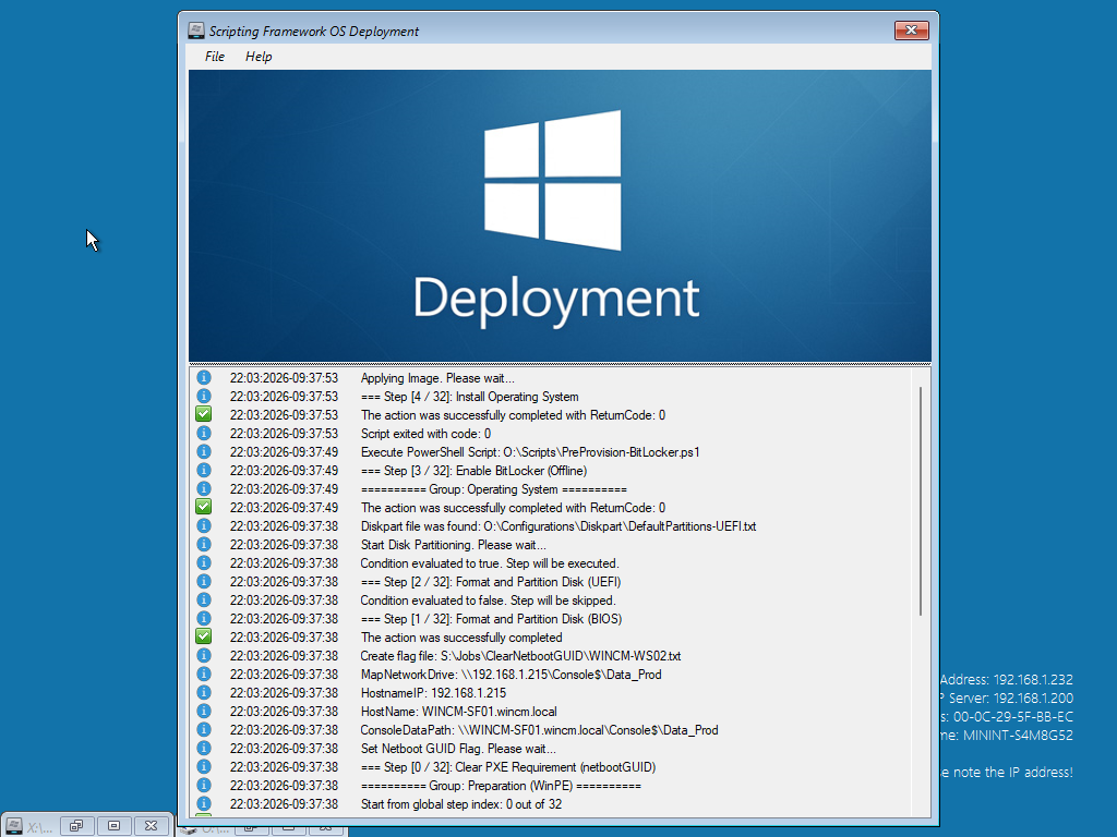 Das Scripting Framework System Deployment ermöglicht ein automatisiertes Deployment von Software und Betriebssystemen und stellt eine vollständige Lösung für Ihre OS- und Softwareverteilung dar. Die Console basiert auf unserer eigens entwickelten Deployment-Technologie und bietet eine benutzerfreundliche sowie intuitive Oberfläche für die Konfiguration des Deploymentprozesses. Die Bedienung ist besonders smart und einfach, sodass der Deploymentprozess ohne grosse Einarbeitung schnell und effizient umgesetzt werden kann.